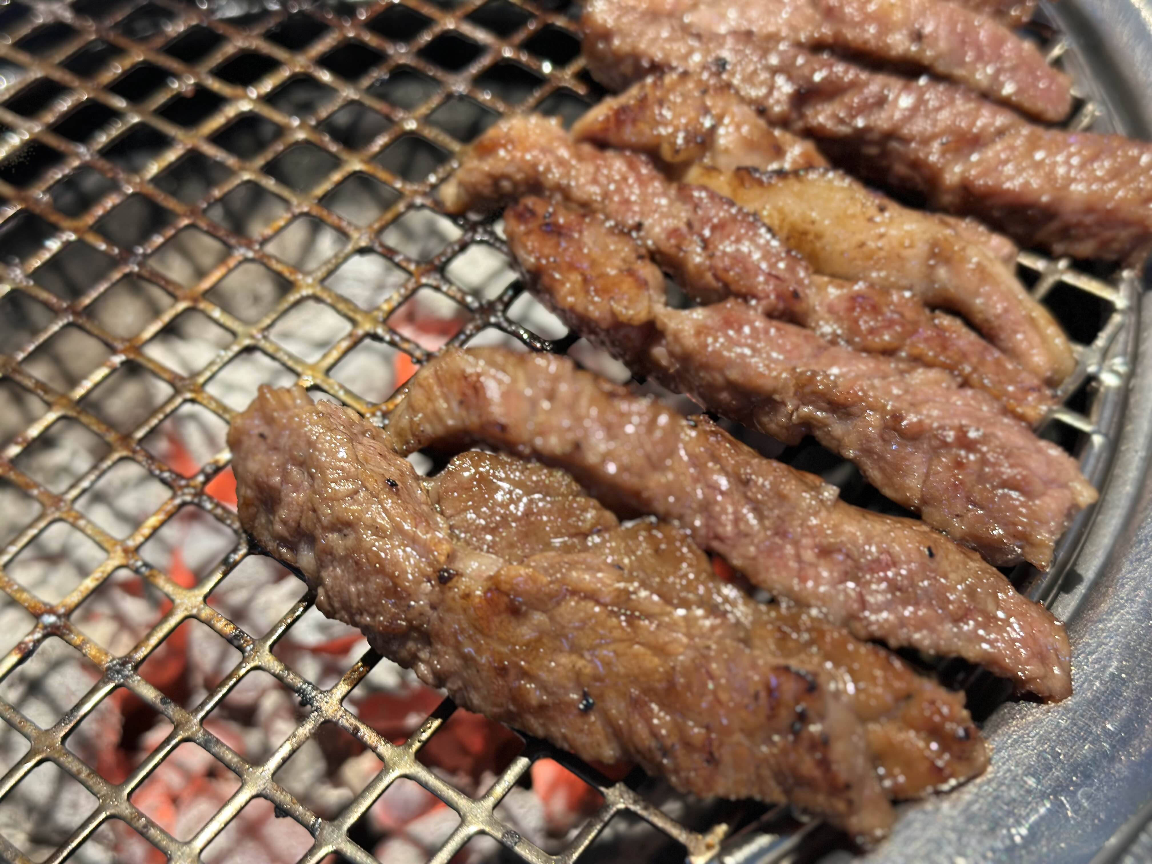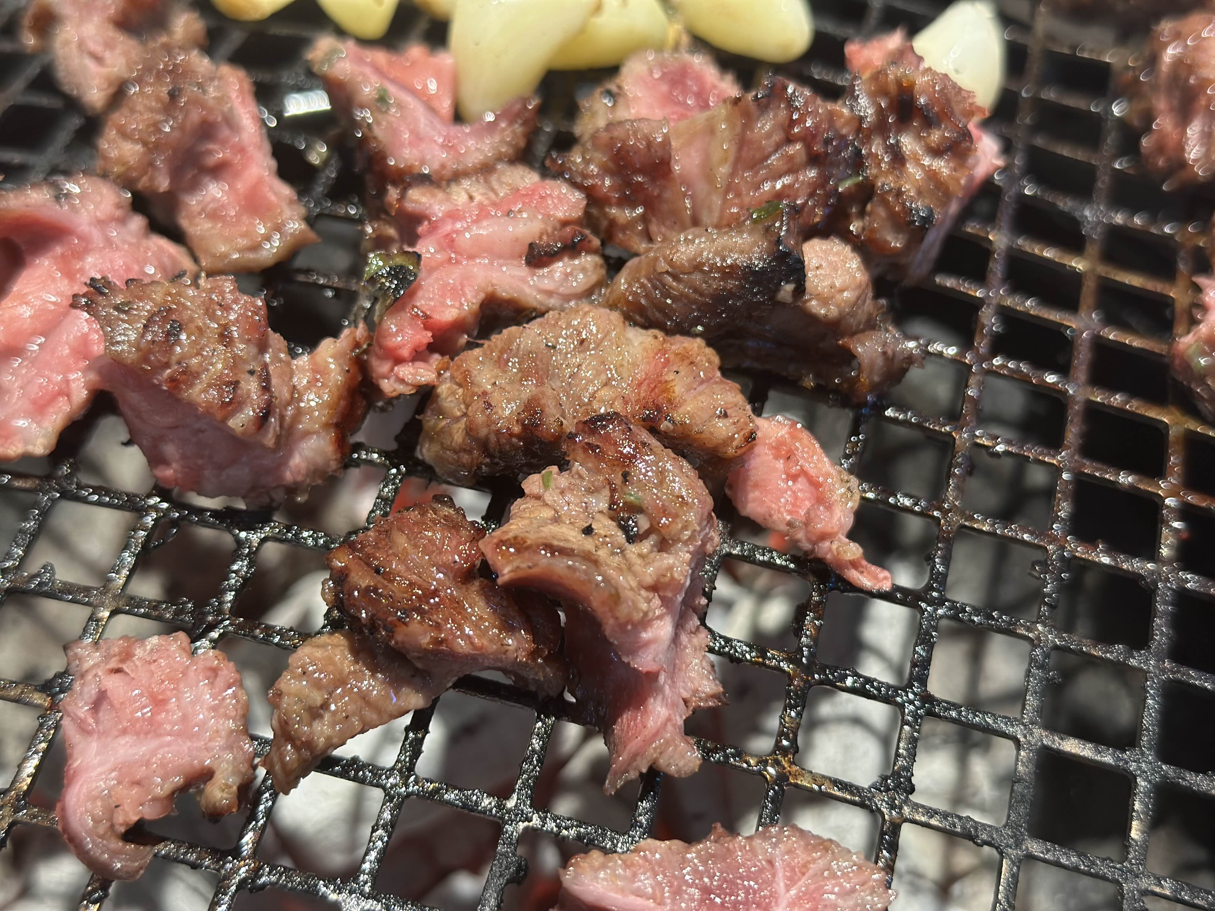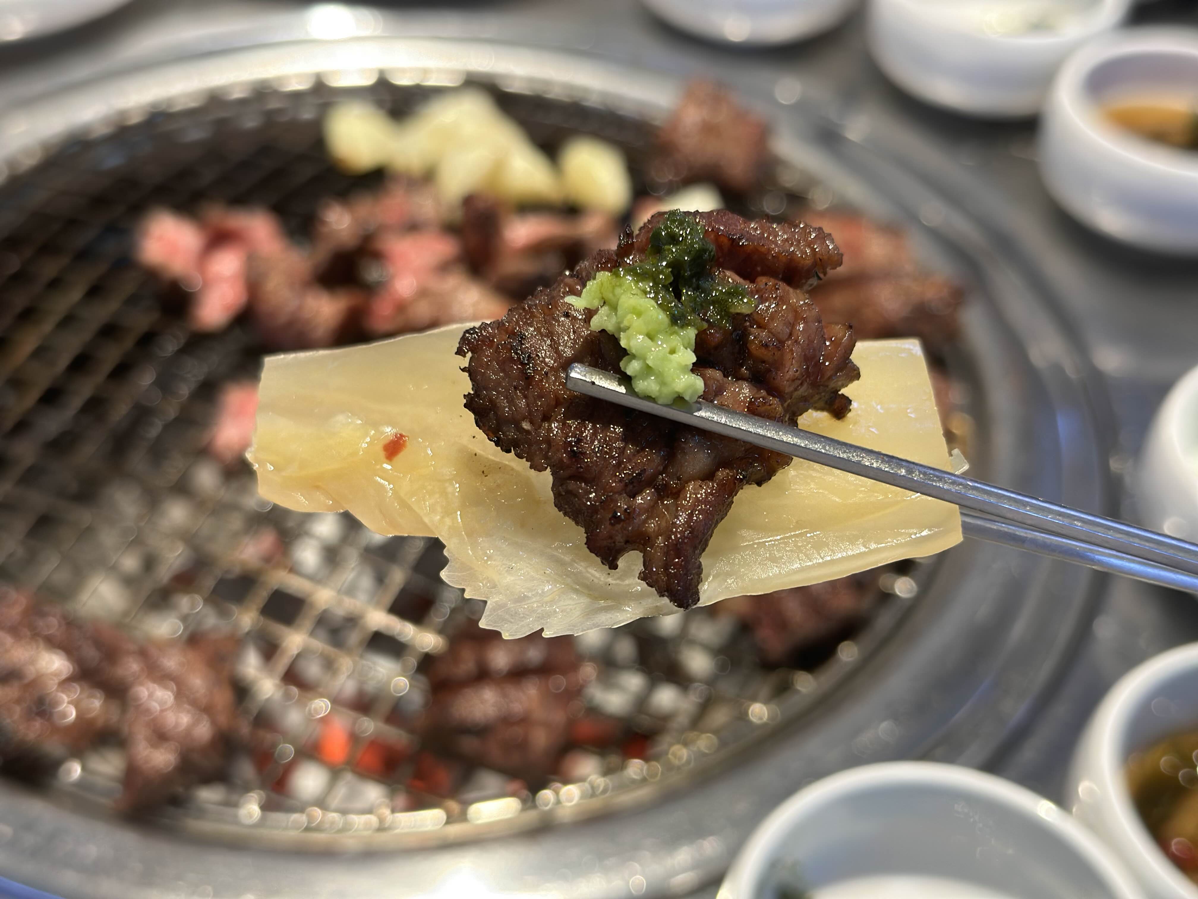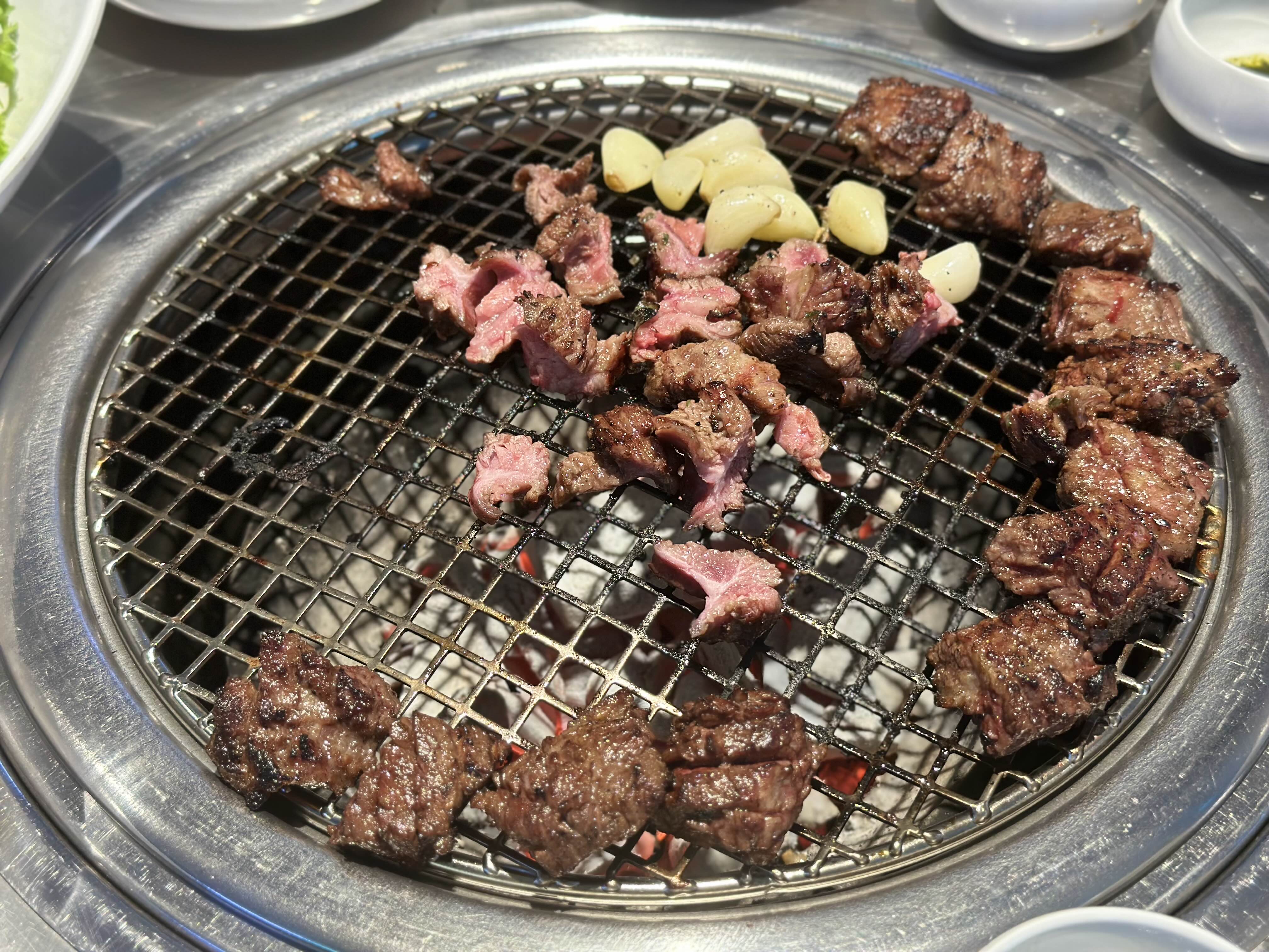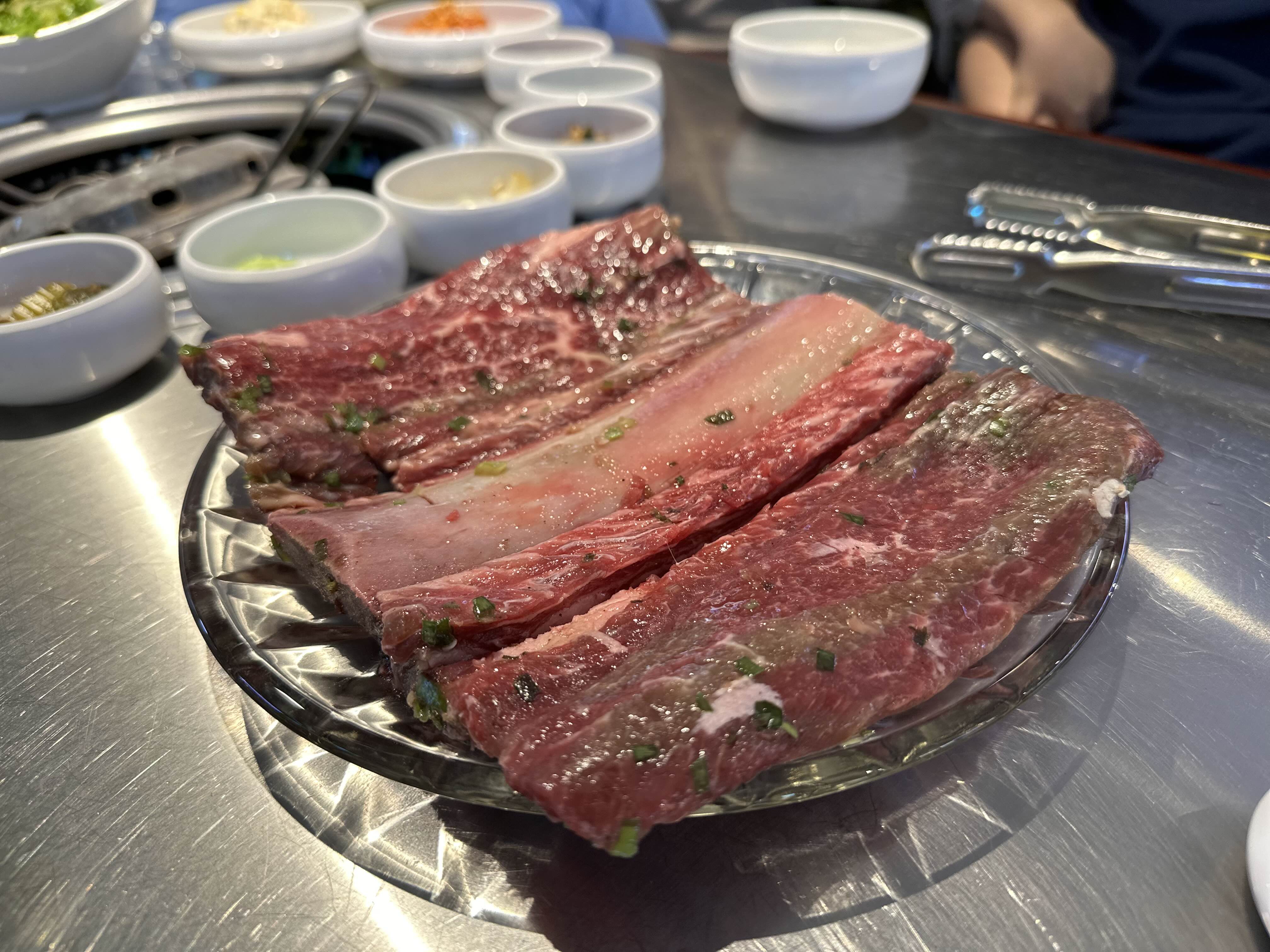 분홍빛 미듐웰로 구워주신 살코기는 도톰하게 썰어주셨고 불판 가운데에서 갈빗대에 붙은 고들살을 바짝 익혀먹으라고 하시네요.