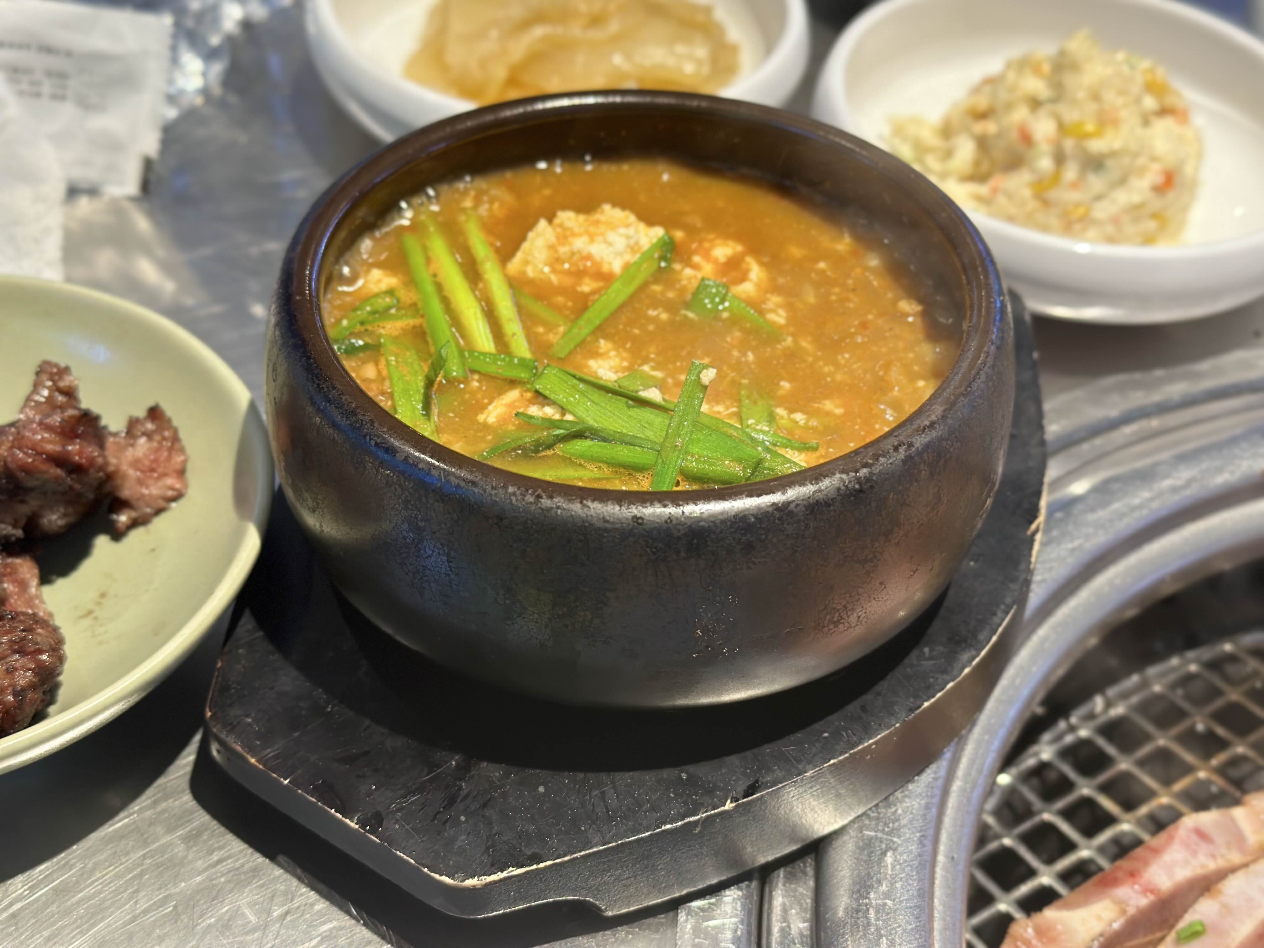 찌개는 끓이며 먹어야 제맛이죠. 뚝배기를 불판에 올려두고 고기랑 같이 제대로 식사했어요.