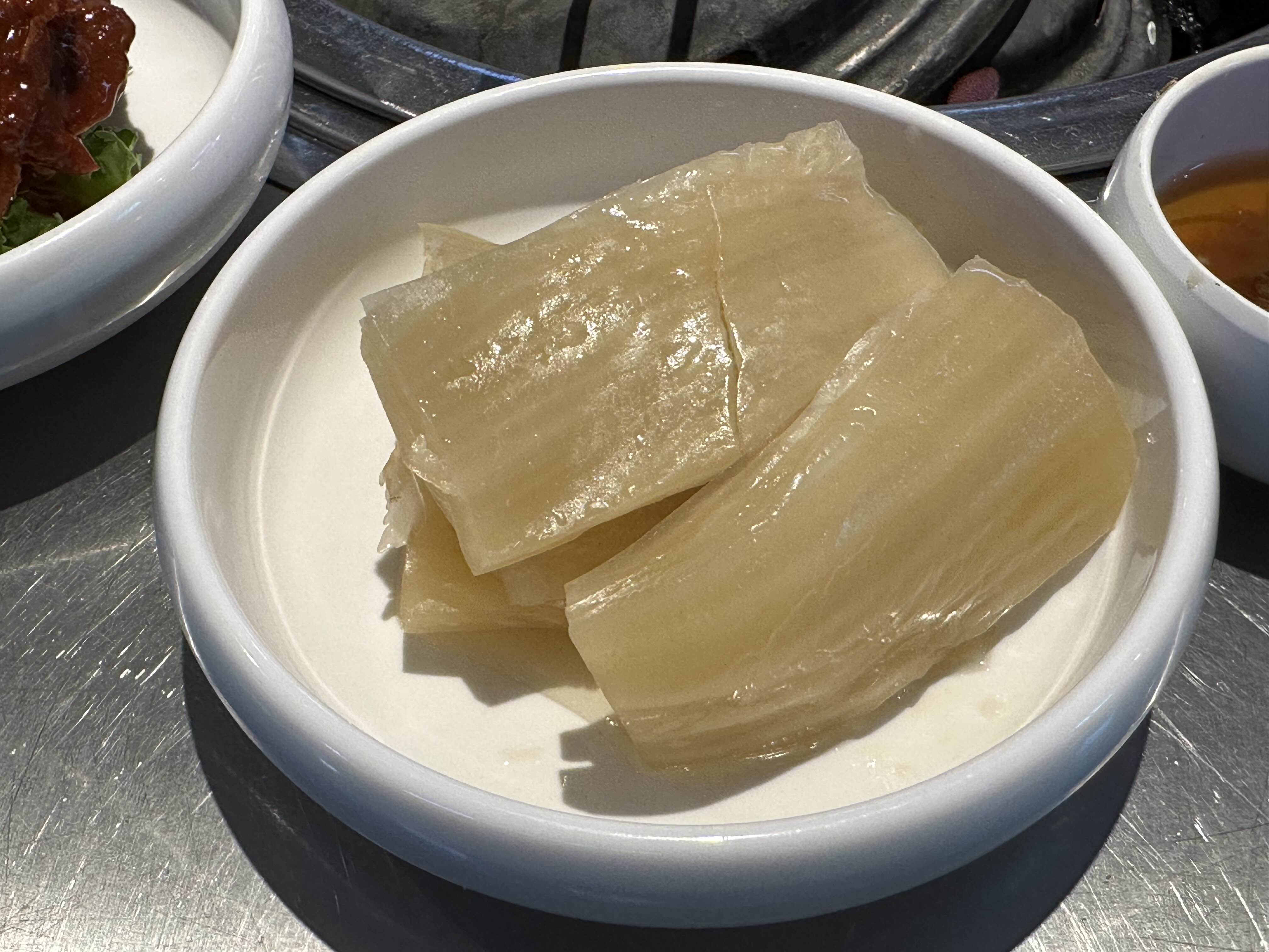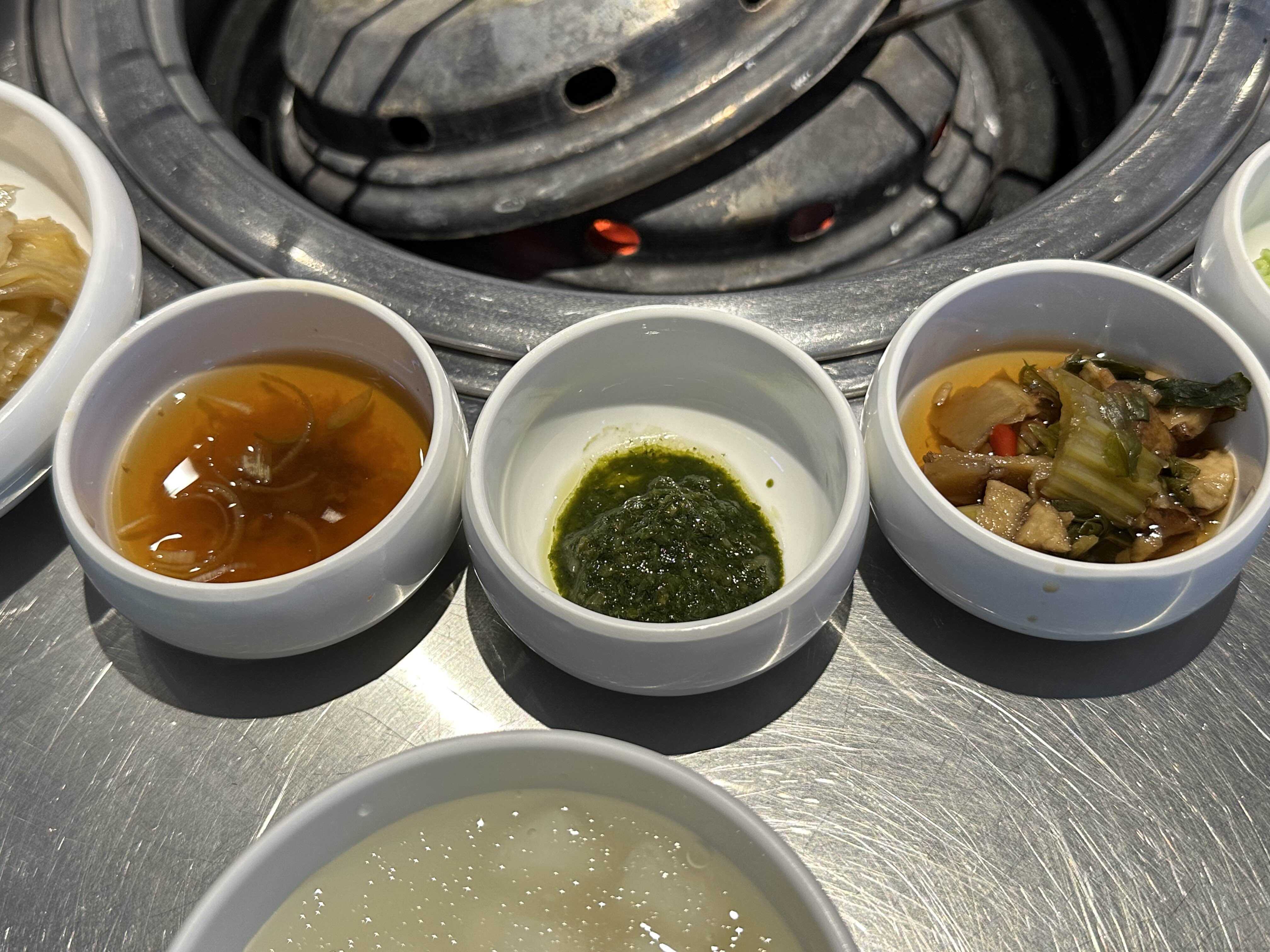 소스와 가니시로 작은 종지에 달달한 갈비소스, 향긋한 깻잎페스토, 단짠 장아찌, 알싸한 생와사비와 한 번 쪄서 나온 듯한 마늘이 나와요.