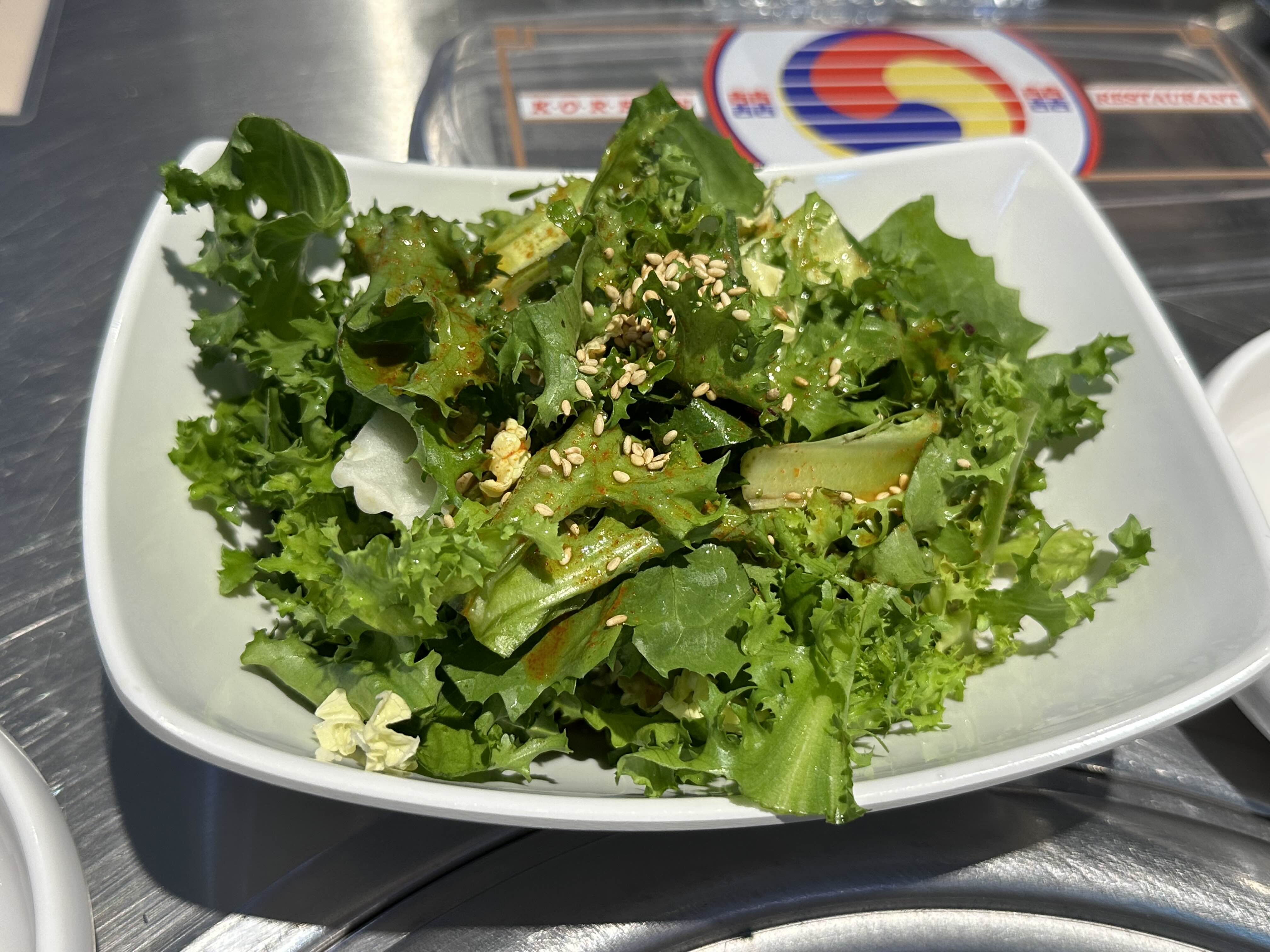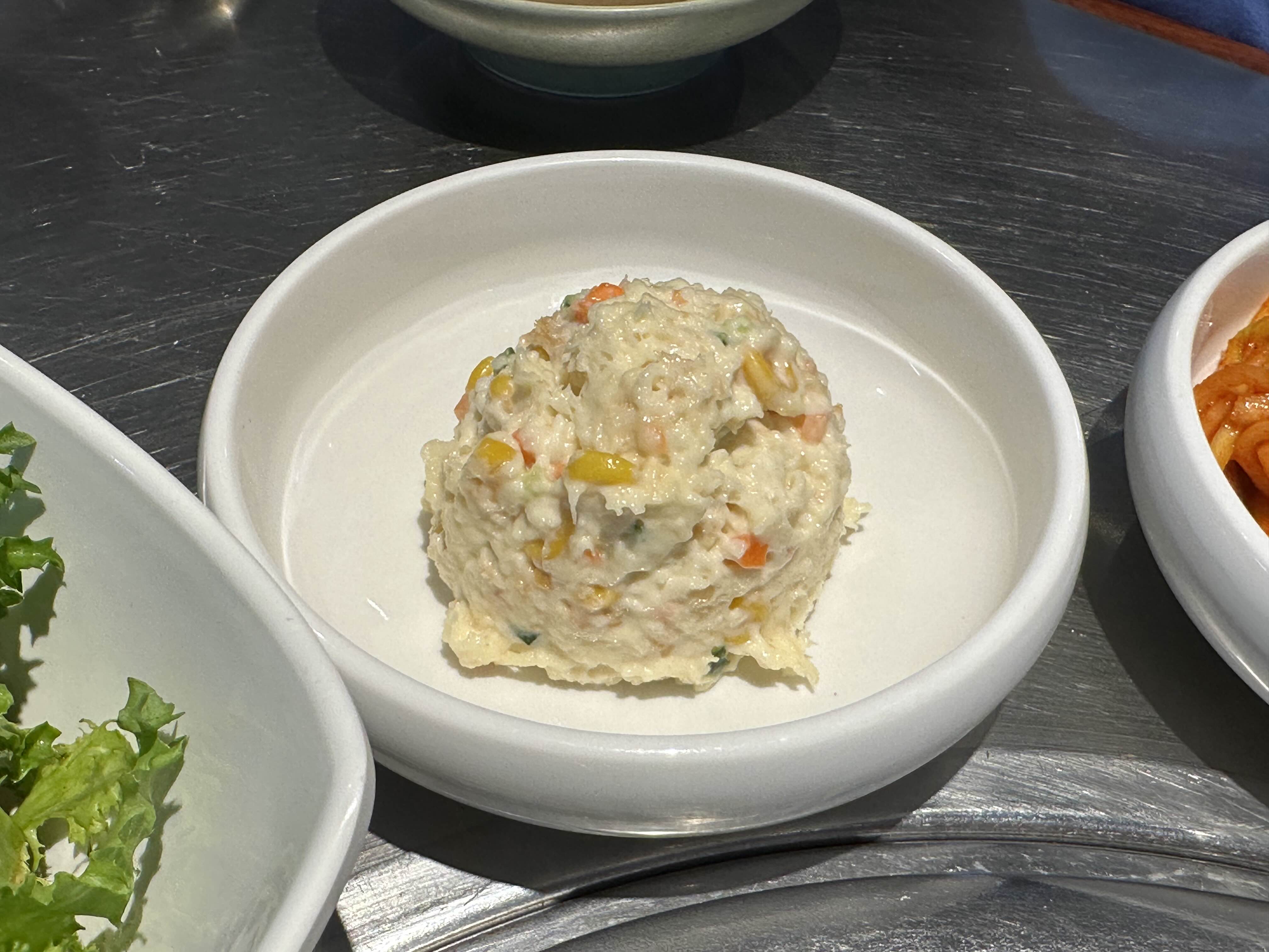 살이 꽉찬 매콤달콤 양념게장, 새콤하고 아삭한 묵은지쌈, 꼬들꼬들 무생채, 내용물이 실한 옥수수 샐러드, 새콤한 드레싱과 쌉쌀한 치커리 무침, 살엄음이 꽉차서 시원한 동치미가 나와요.