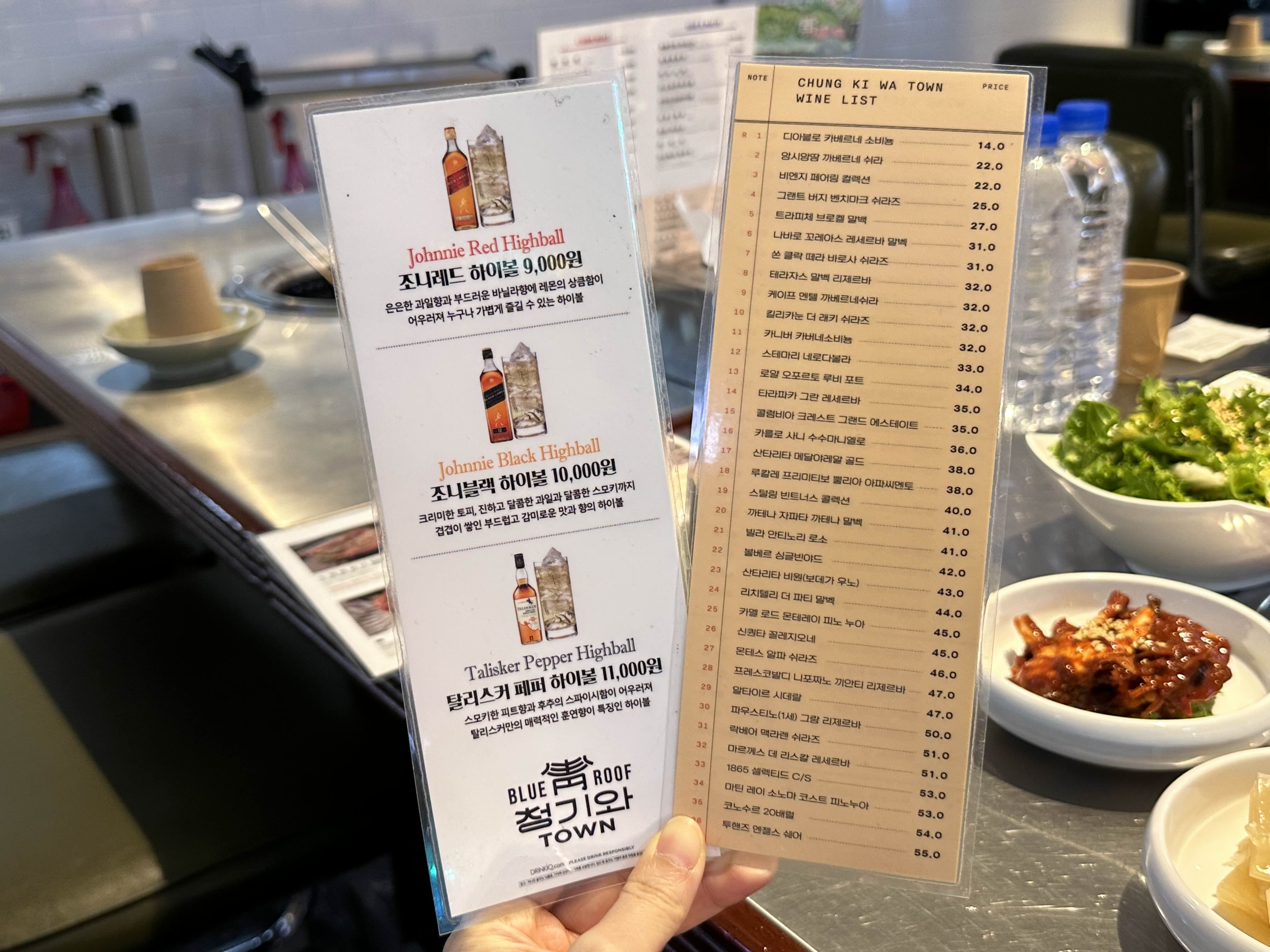 하이볼 종류가 3가지나 되네요. 와인 리스트는 양면으로 빼곡하고 콜키지도 프리라고 하니 마음껏 가져온 와인을 즐길 수도 있겠어요.