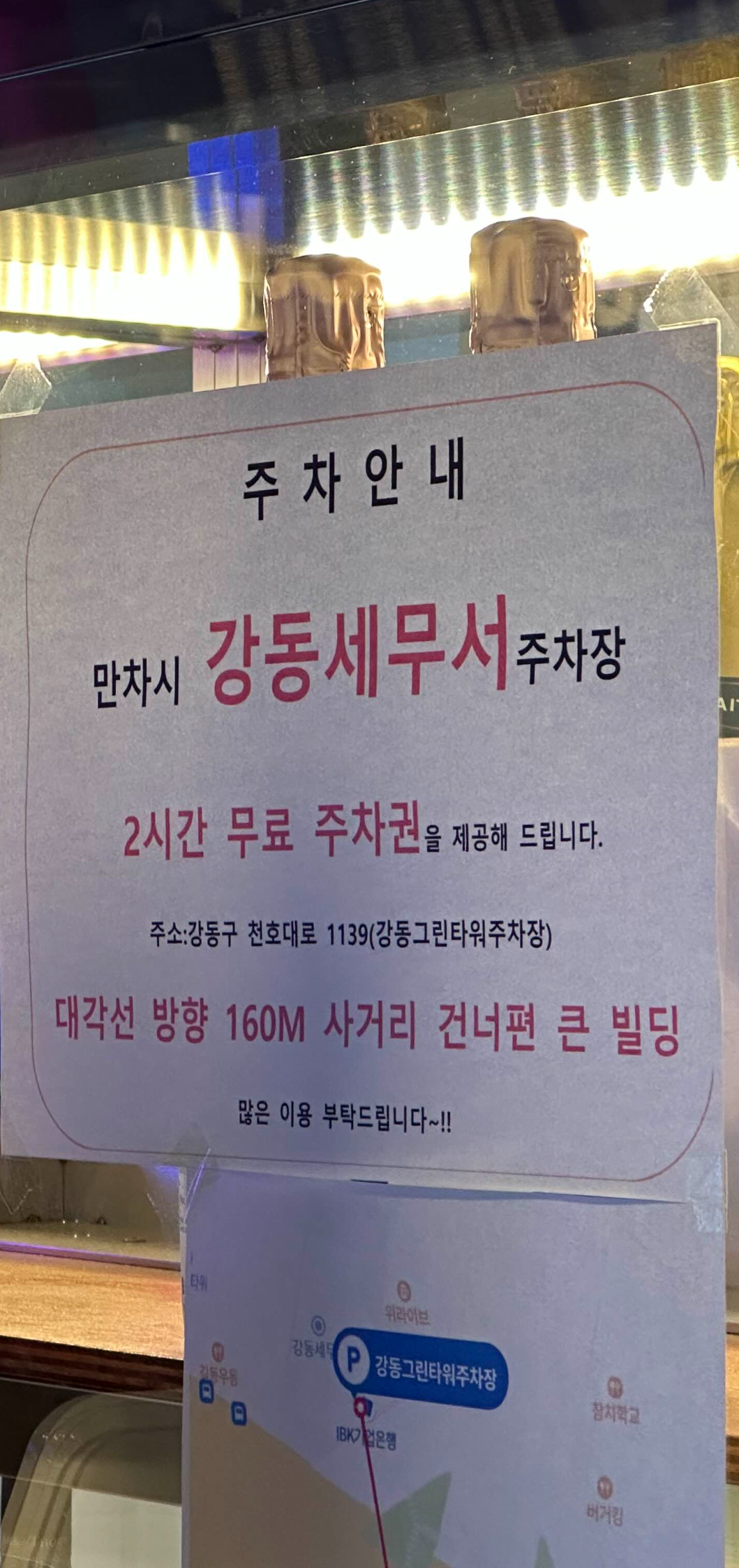 주차는 건물 앞 주차장에 가능하지만 만차일 경우엔 근처 강동그린타워주차장(강동세무소건물)으로 2시간 무료 주차권을 준다고 해요.