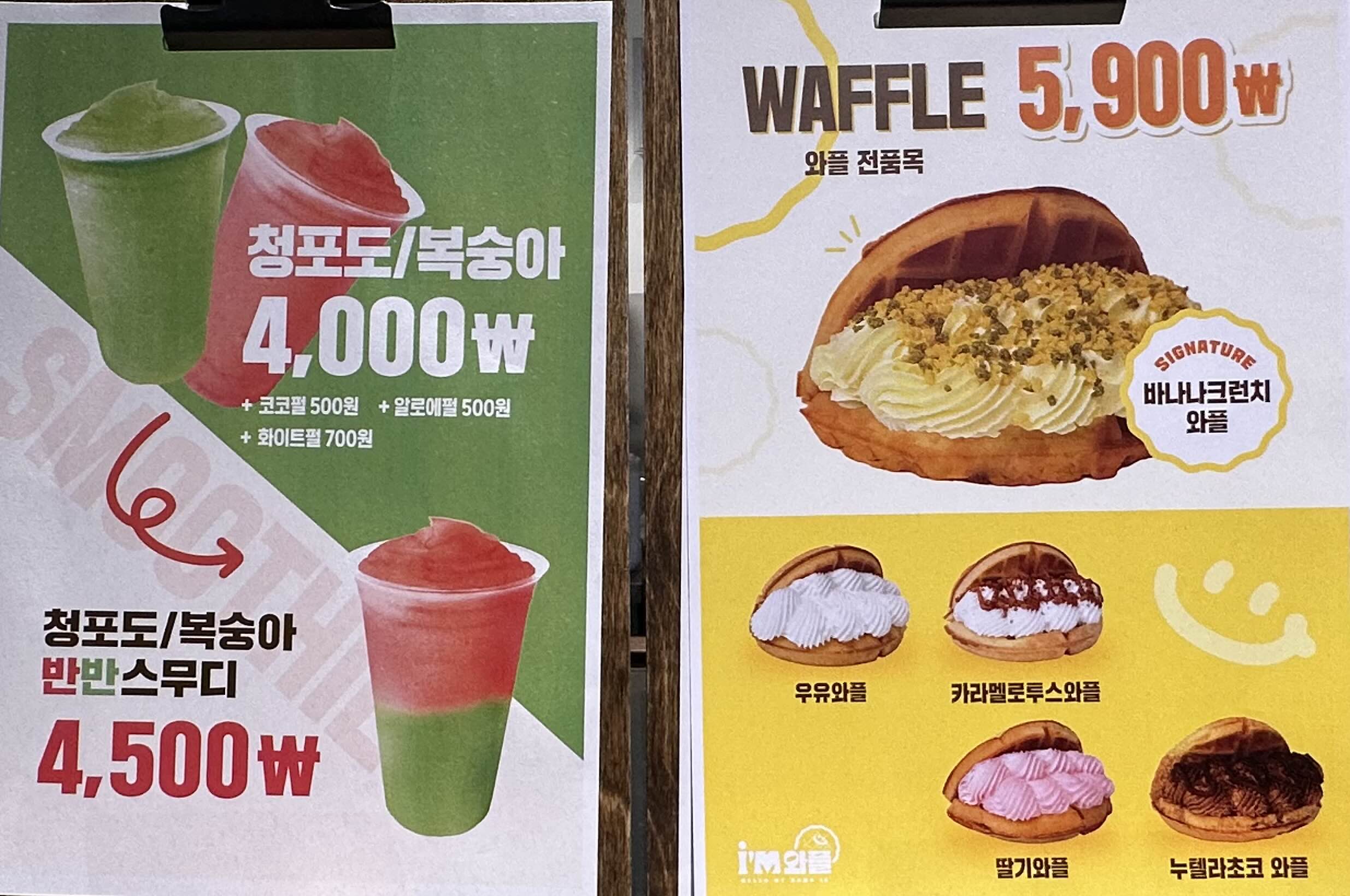 와플 5가지 메뉴와 청포도, 복숭아 스무디 두 가지가 있어요. 와플 가격은 5900원이에요.
