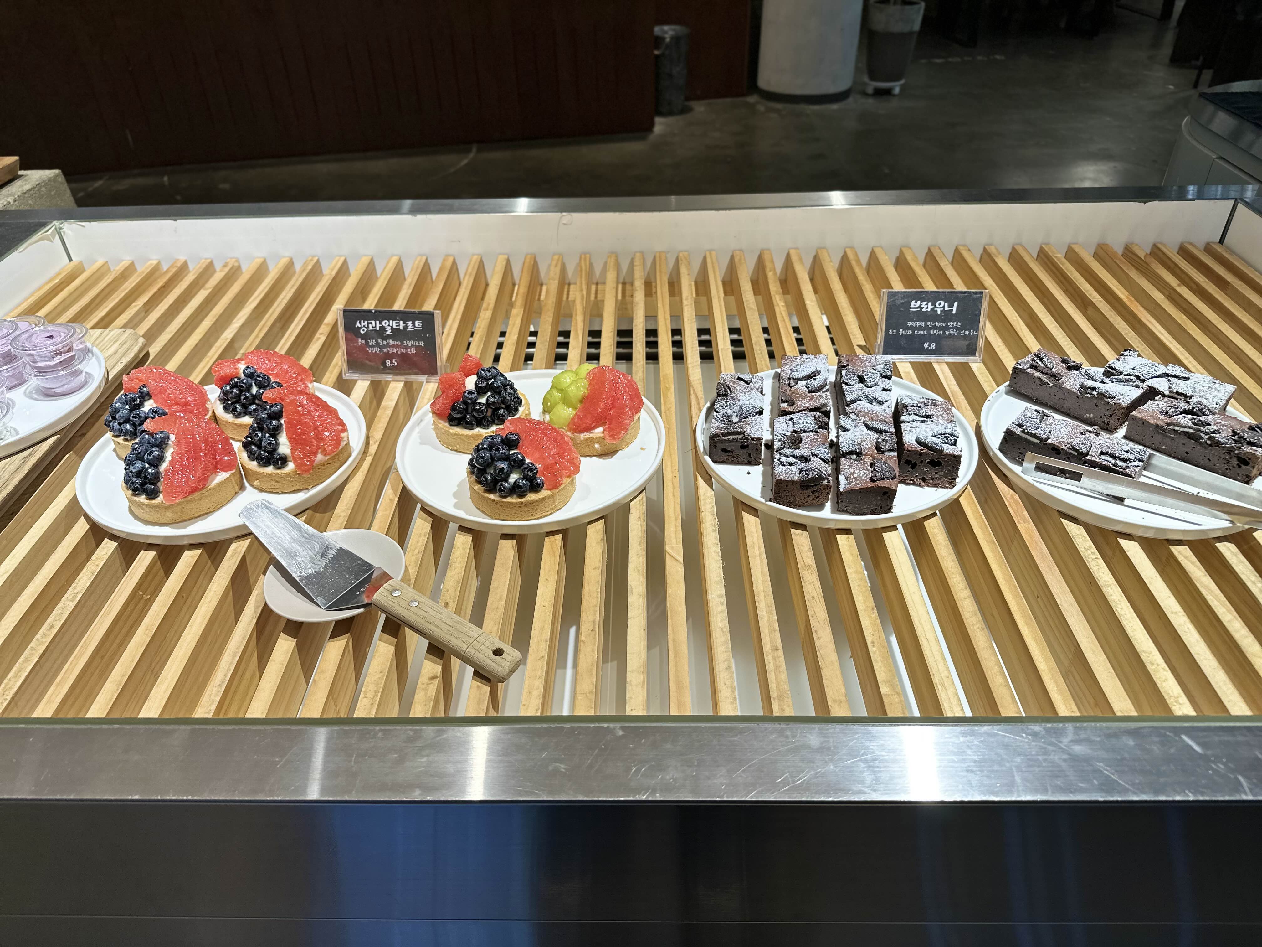 카페 메뉴와 주스나 티, 에이드도 있어요. 대표적인 메뉴로는 서울 라테와 검은콩 미숫가루, 블루베리우유, 오로라 레모네이드가 있어요.
