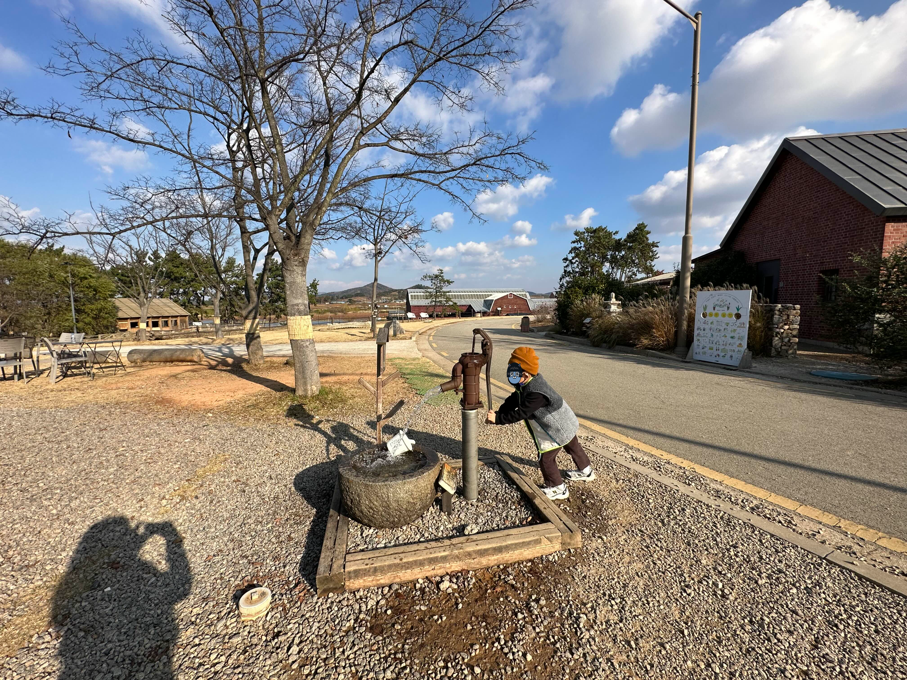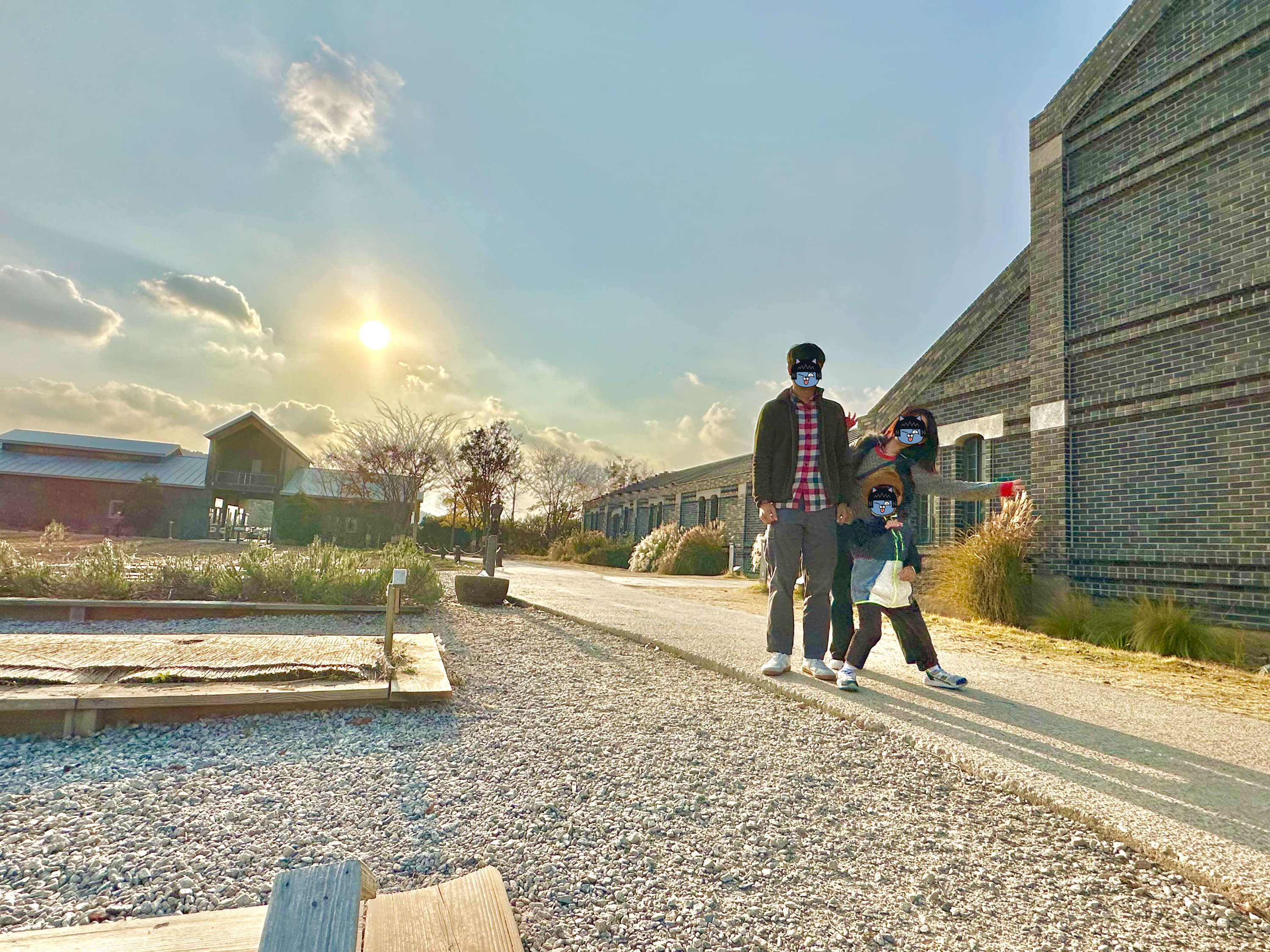 해 질 녘의 농원과 벽돌 건물이 멋졌어요.