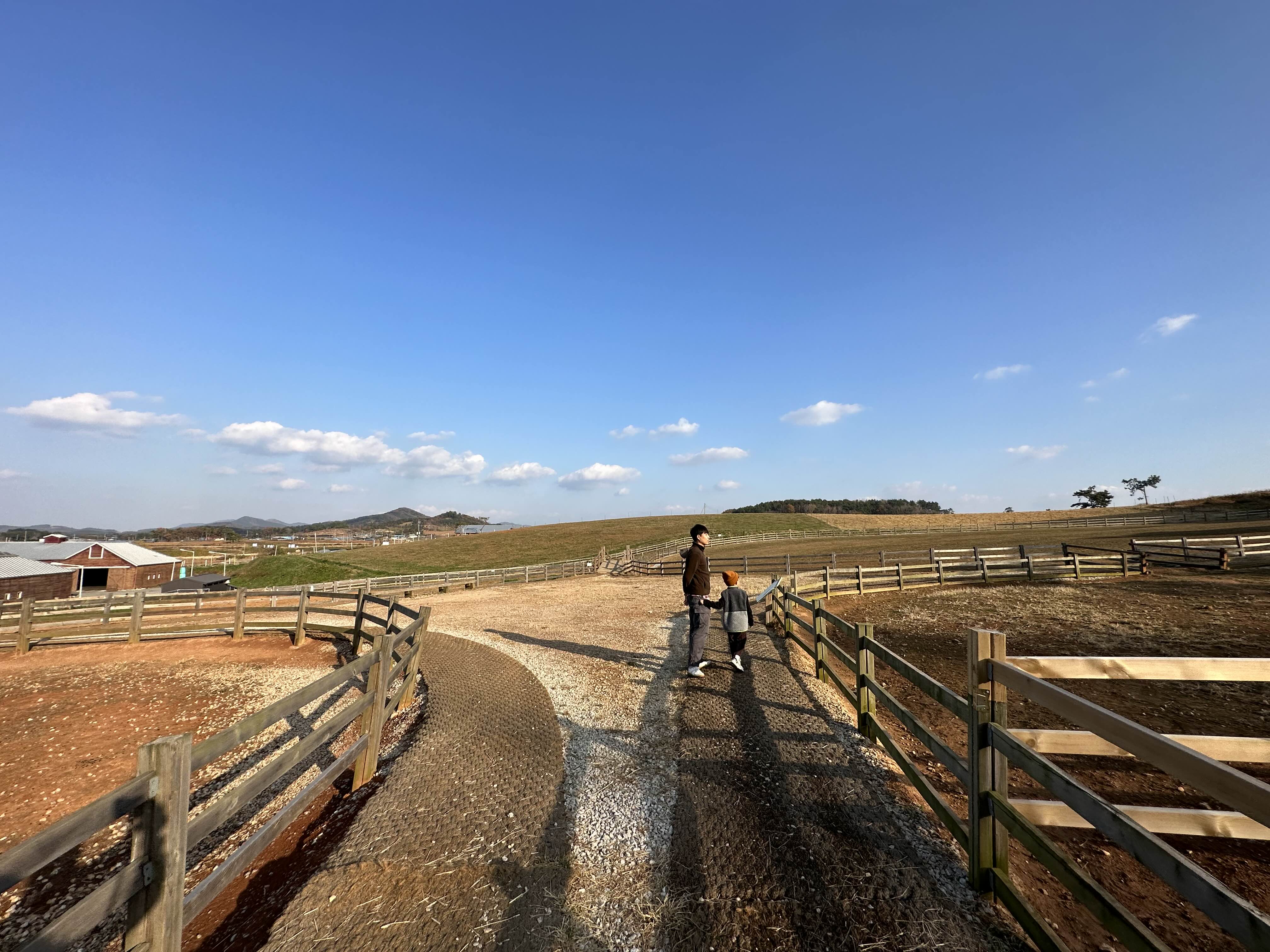 해 질 무렵이라 동물들은 축사로 돌아갔나 봐요. 휑하지만 그래도 멋져요.