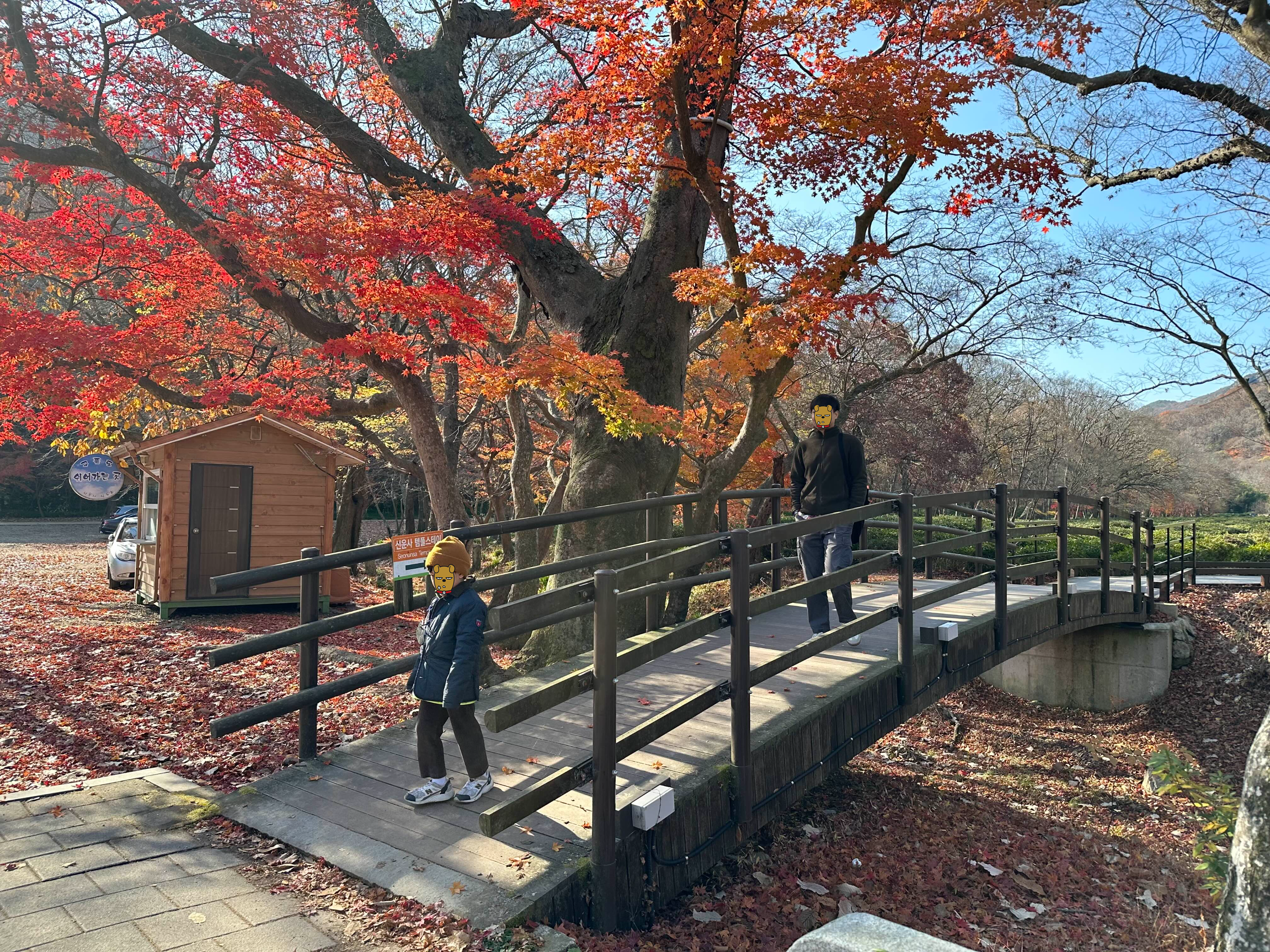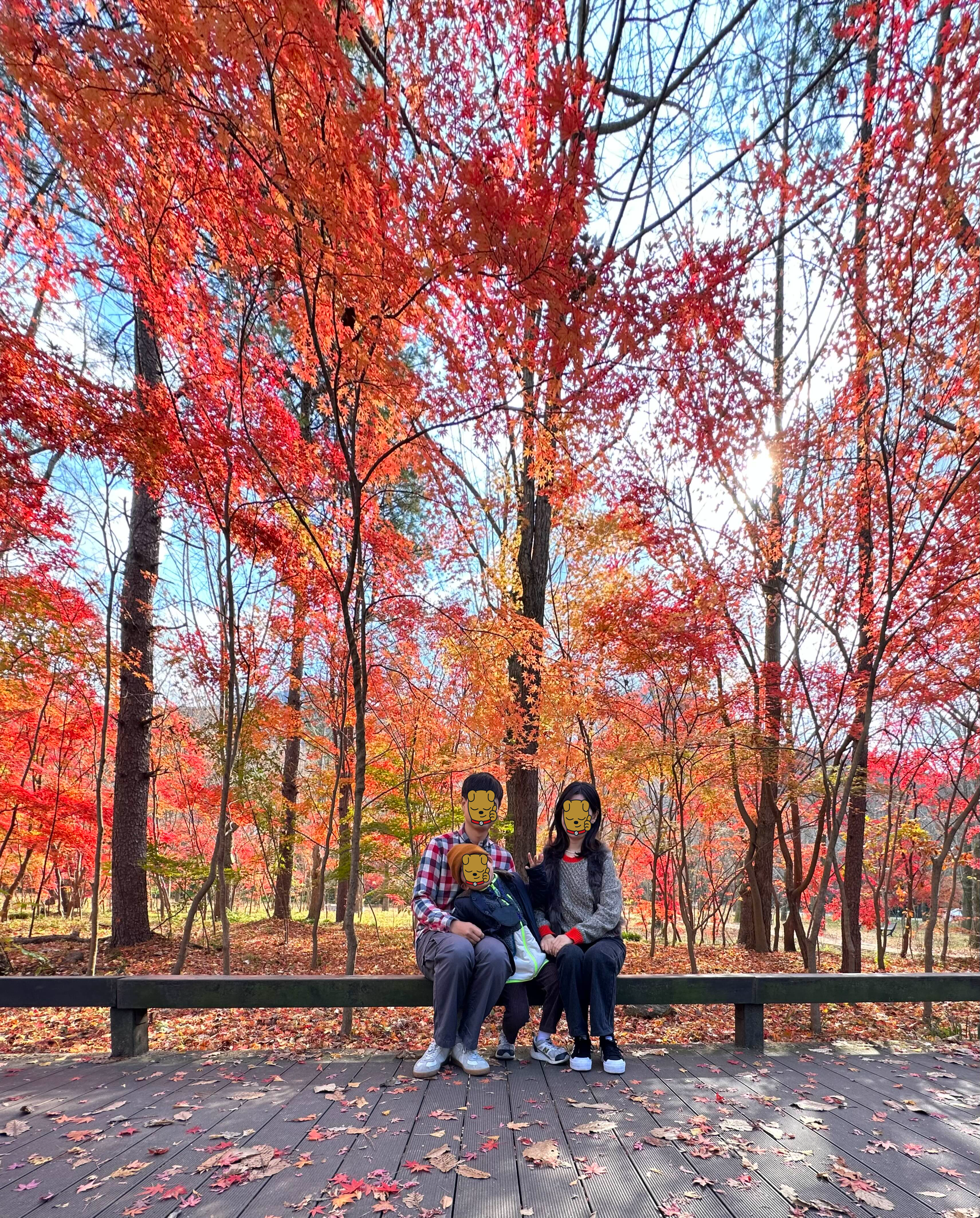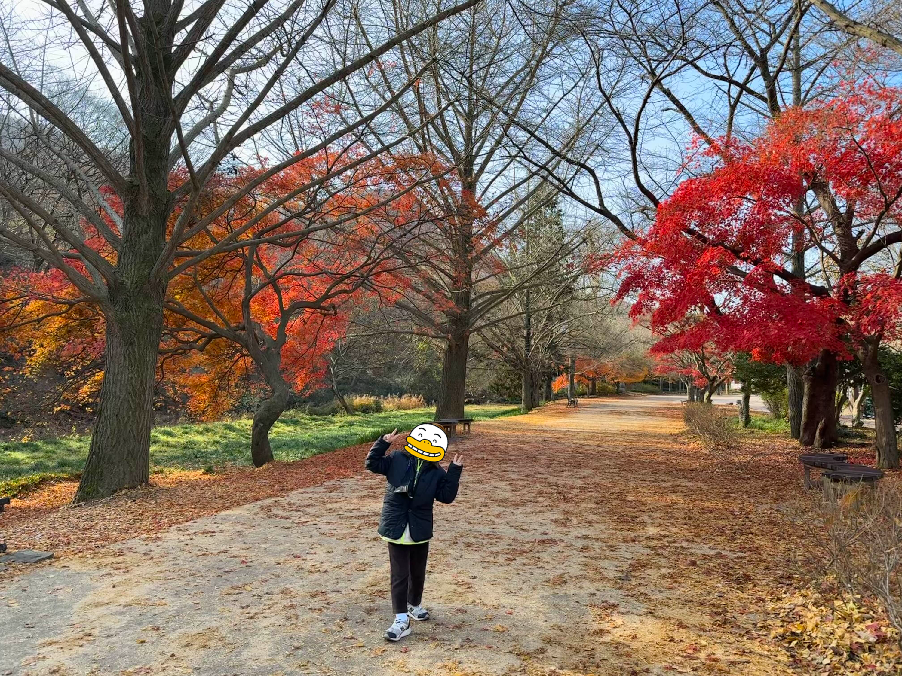 방문하기 전 주에 비가 내려서 낙엽이 잔뜩 떨어졌네요. 다행히 단풍이 남은 두 그루 나무 밑에서 포즈를 취해보았어요.
