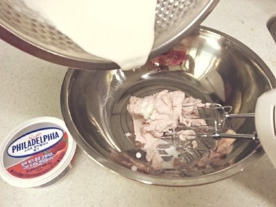 ⑨ 딸기맛 크림치즈에 사워크림을 넣고 거품기로 약하게 젓고 8도 나눠 섞는다.