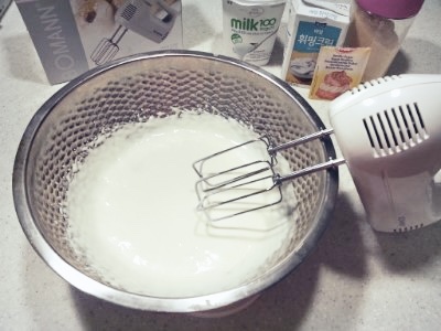 ⑧ 생크림에 바닐라설탕, 설탕을 나눠 넣어가며 휘핑한다.