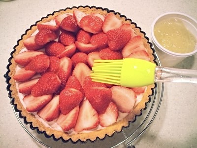 ⑪ 딸기를 세로로 반 잘라서 장식한 후 미로와를 바른다.