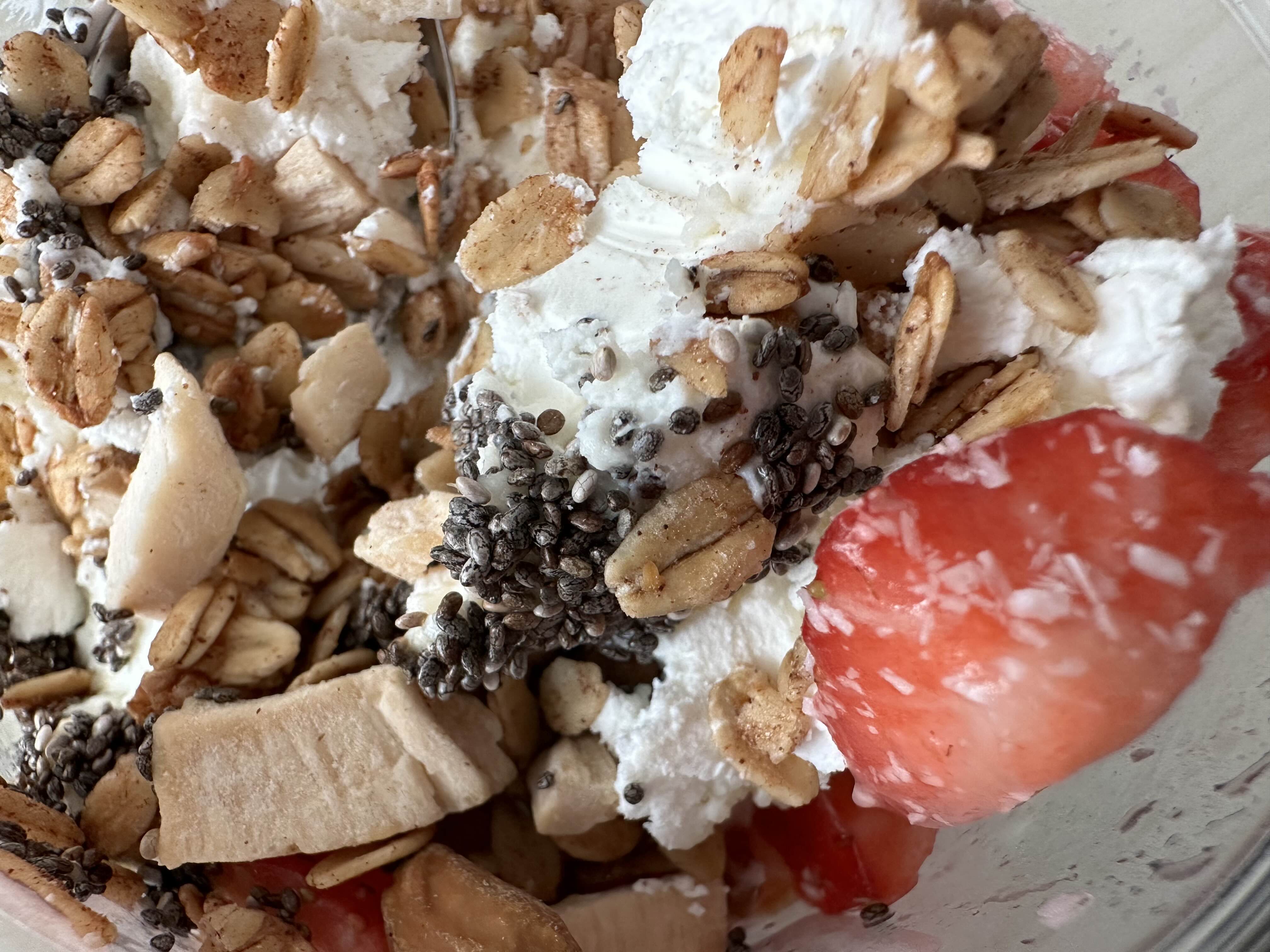 플레인(무가당) 그릭요거트 + 그래놀라 + 아가베시럽 (딸기,코코넛청크,치아씨드,피스타치오,)