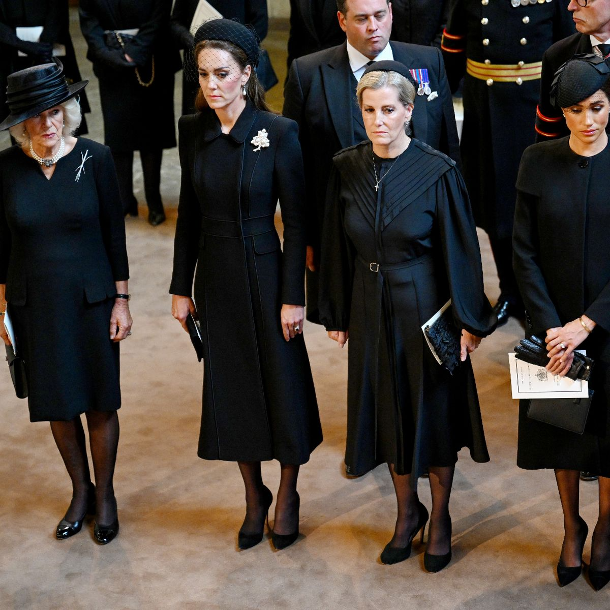 좌측의 여러 겹의 목걸이는 우리나라에서는 조금 부적절해 보이네요. 우측은 얼마 전 영국 여왕의 장례식에서의 케이트미들턴 과 메건마클의 모습인데 간소한 브로치 장식이 적당하고 격식있어 보이네요.