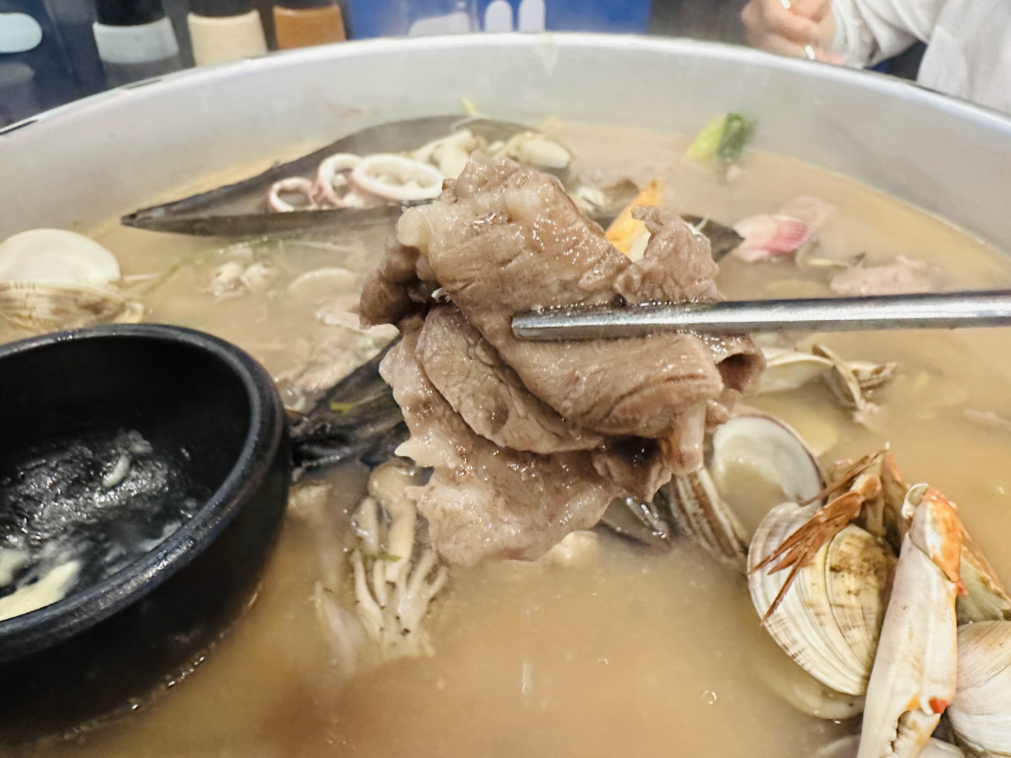 다 먹고 칼국수를 끓이기 전에 낙지를 추가해 보았어요. 소고기와 해산물이 졸아든 육수가 정말 말도 안 되게 시원하고 감칠맛이 돌더라구요.