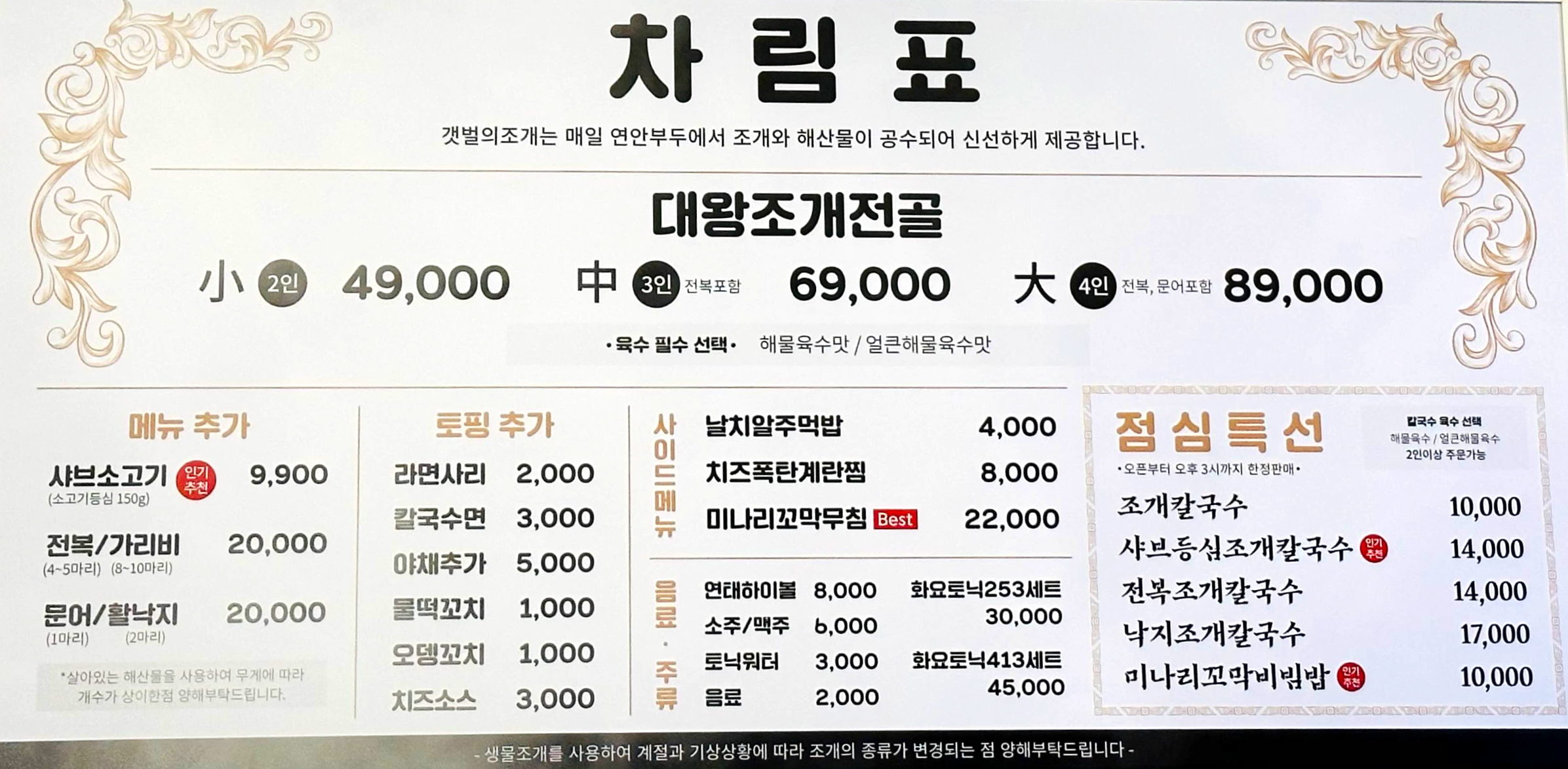 대왕조개전골 소자+샤브소고기 2개+활낙지2마리+칼국수1개