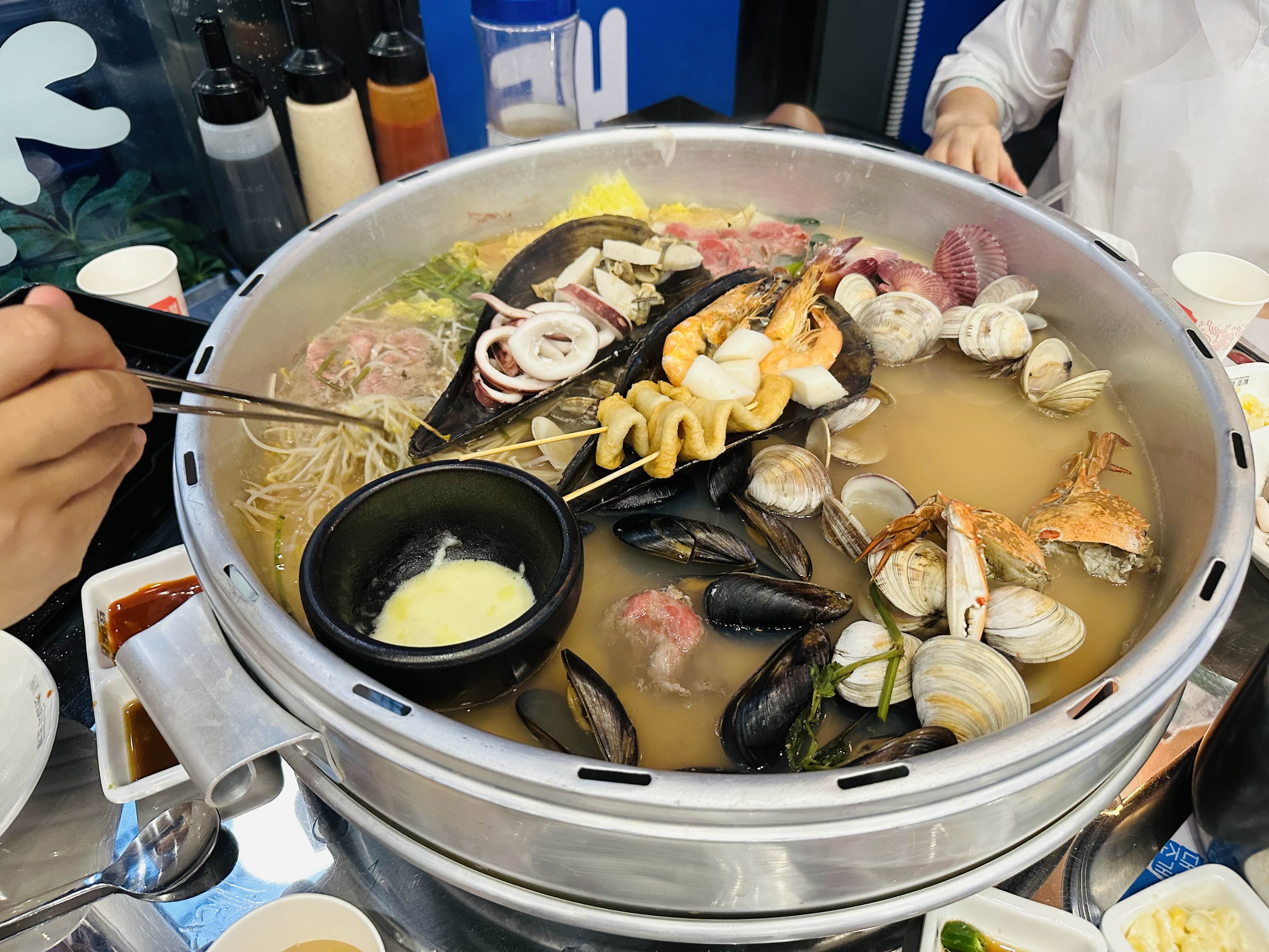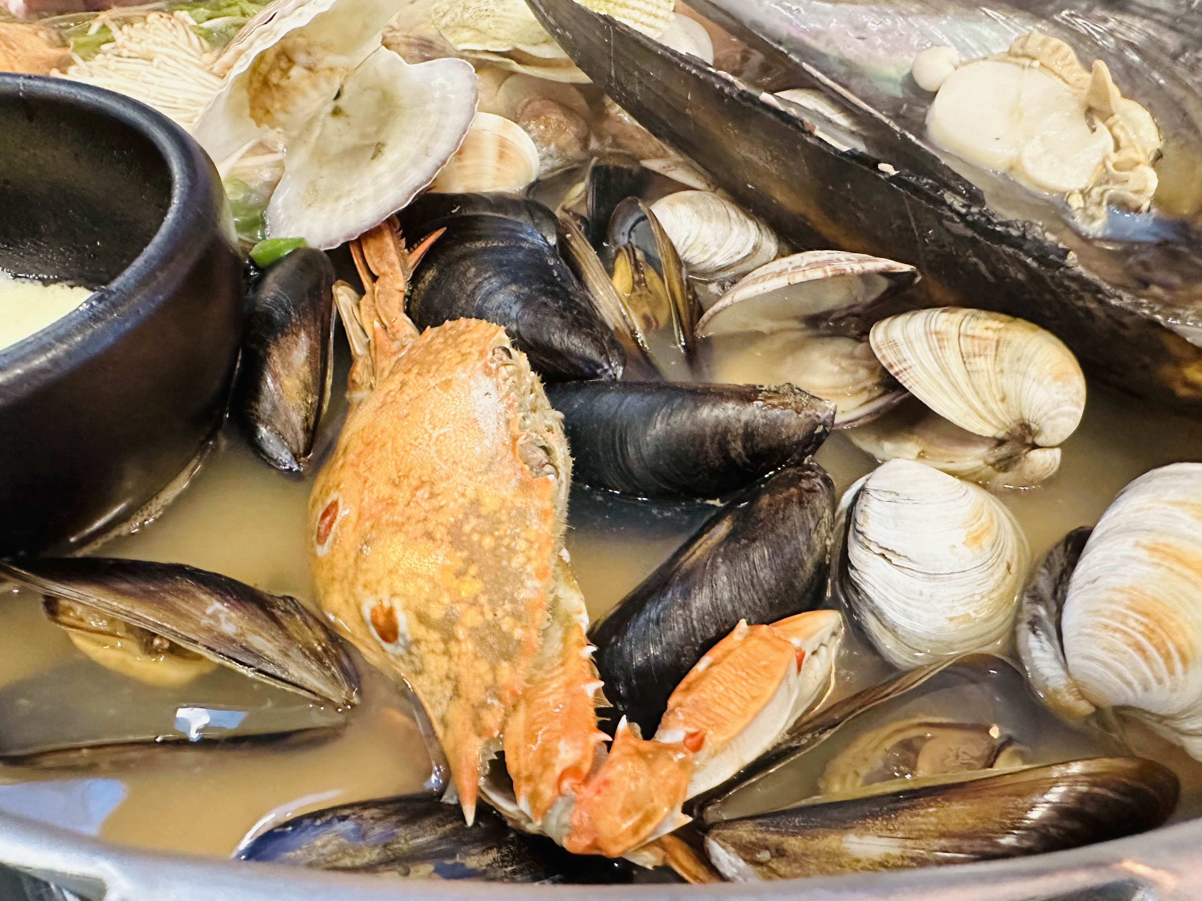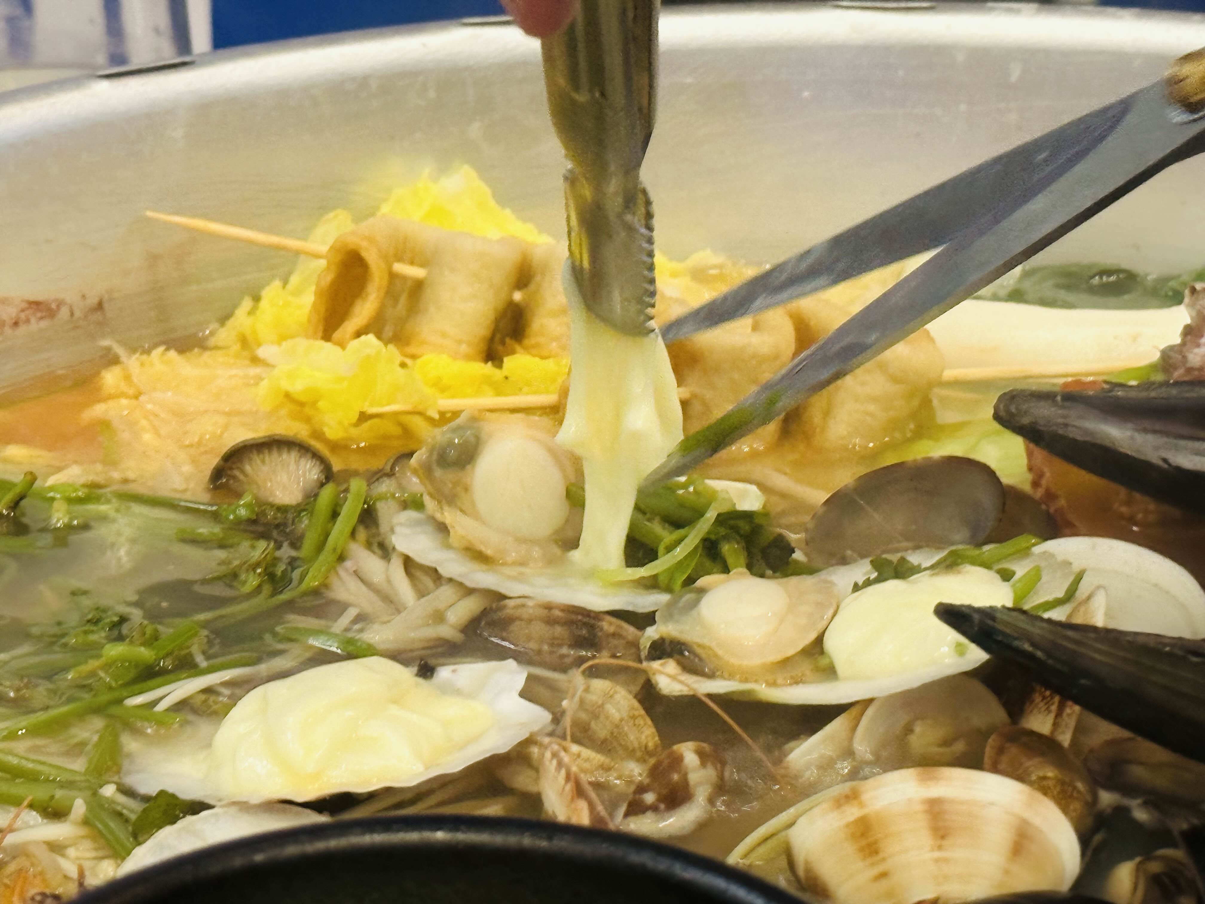 11분 조리가 끝난 조개전골의 모습이에요. 김이 엄청나지요. 직원분께서 오셔서 직접 재료 손질을 다 해주셔서 먹기 굉장히 편했어요. 뚝배기에 든 모차렐라 치즈를 가리비, 미나리와 곁들여 먹게 해 주시는데 정말 맛이 좋았어요.